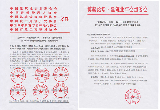 金馬威工程咨詢有限公司入圍“2015建筑業年會暨中國建筑金磚獎”2015全國造價咨詢AAAAA級信用示范單位,周和生董事長入圍“2015建筑業年會暨中國建筑金磚獎”2015全國工程造價咨詢誠信企業家。